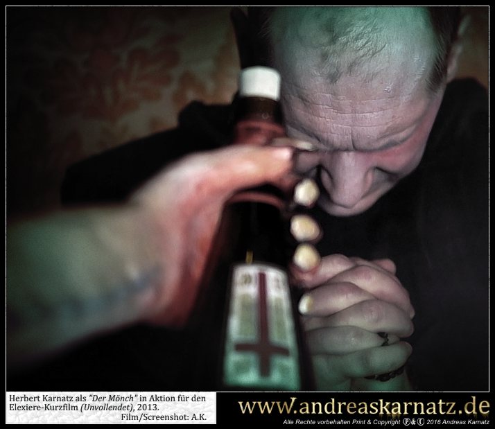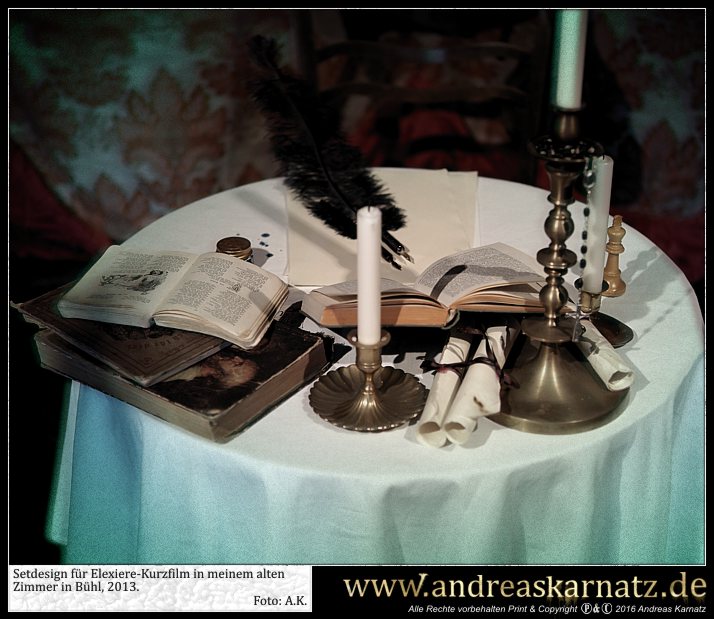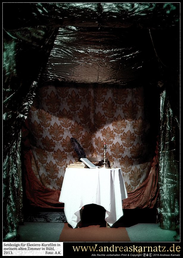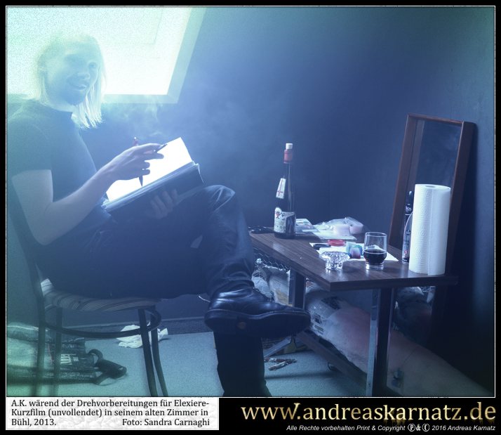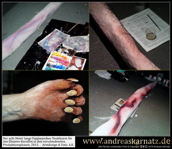 Teil 1: Ich liebe Filme! Irgendwie funktioniert mein ganzer sozialer Ansatz über das Ding Film. Fanatismus, Nerdism, Freakism oder einfach nur Besessenheit. Keine Ahnung! Meine Liebe für alte VHS-Kassetten, die sich zu hunderten in meinem Keller stapeln, gründet wohl auf jenem nostalgischen Gefühl, das zurück in meine Kindheit führt. Ich wuchs mit diesen klobigen schwarzen Dingern auf. Es war immer das Wochenend-Highlight, wenn ich mit meinem Vater in die Videothek ging und wir 'ne volle Tüte mit Filmen nach Hause brachten. Natürlich ist diese Vergötterung für die meisten Menschen nicht nachvollziehbar. Ihnen geht es ja nur um den schnellen Konsum und nicht um das damit verbundene Ritual. Filme werden viel zu oft konsumiert statt zelebriert. Wie überall werden Vorspiel und Dramaturgie nicht berücksichtigt. Wie gesagt, bin ich von Filmen total eingenommen; und lasse auch kein gutes Streitgespräch darüber aus. Daher war es nur eine Frage der Zeit, bis ich meine ersten eigenen Schritte in jene Richtung unternehmen würde. Die Idee einen eigenen Kurzfilm zu drehen, bekam ich durch einen anregenden Zeitungsartikel über den Günzburger Jungfilmer Simon Ritzler. Wieder einmal total vom Ehrgeiz gepackt, war schnell eine MiniDV-Kamera gekauft und die ersten Szenen, ohne großartig darüber nachzudenken, aufgenommen. Die einzelnen Takes wurden anschließend am PC zusammengewurschtelt. Anfänglich natürlich ziemlich ungeschickt, aber das erste Filmchen kann sich sehen lassen und trat auch noch im 1. mittelschwäbischen Kurzfilmwettbewerb in direkte Konkurrenz mit Simon Ritzler´s Filmen "Silentium" & "Parabola". Die beiden wirklich atmosphärisch gelungenen Arbeiten gingen leider leer aus, doch dafür bekam ich den Publikumspreis verliehen. Zum Glück kannten sich die Leute nicht sonderlich gut mit Musikclips aus, denn in einer Passage von "Oktober", hab ich doch glatt einen "Sigur Rós" Clip von Floria Sigismondi kopiert. Na ja, sei mir verziehen. Ein Jahr später habe ich ein weiteres mal am Kurzfilm-Wettbewerb mit meinem Marionetten-Filmchen "LaLa" teilgenommen. Mir ging es bei meinen Kurzfilmen nie um eine gute Story, sondern vielmehr um die visuelle Umsetzung der Bilder. Das Filmen betrachte ich nach wie vor als reines Hobby und daher soll es auch durchaus Witzig sein und Spaß machen. Intelektueller Anspruch muss da nicht vorhanden sein. Das Basteln und Designen der Kulissen, Marionetten und Requisiten hat zwar immer viel Zeit in Anspruch genommen, doch für ein solch amüsantes und kurzweilige Ergebnis wie bei "LaLa" opfert man doch gerne seine Freizeit. Es waren kleine Mammutprojekte, die ich alleine im Keller verwirklichte. Man braucht auf jeden Fall viel Fantasie um z.B. in einer blöden Pappmascheeplatte mit Hügeln, die ich in tagelanger Arbeit zusammenkleisterte, eine Mondlandschaft zu erkennen. Doch nach einer Weile mit viel Sand, einer blinkenden Raketenabschussvorrichtung (gebastelt aus einem alten Rama-Becher) und einem Sternenhimmelpanorama aus kleinen Alupapierkügelchen, ließ sich das trashige Resultat durchaus sehen. Auch wenn niemand, und nicht einmal ich, dahinter steigt, um was es verdammtnochmal in diesem Film gehen könnte. Stellt euch nur mal vor, dass es dem Schöpfer des Universums mit seinem Werk ebenso ergeht. Welch tröstlicher Gedanke. Bis dann zur Spät-Revue! (Dieser Text wurde Anfang 2010 verfasst) Teil 2: Nach Jahren der Regie-Abstinez bin ich 2013 zum Filmen zurückgekehrt. Das lag zum einen an einem Livemitschnitt einer meiner Open-Stage-Auftritte, der mir von einem Kollegen zur verfügung gestellt wurde und zum anderen, dass ich für den Ballettabend "E.T.A. Hoffmann - Eine Moritat" die Videoclips produzieren sollte. Als aller erstes stand ein Kurzfilm auf dem Drehplan, der für den Ballettabend konzipiert war, welcher aber aus Zeitlichen Gründen nicht fertiggestellt werden konnte. Was ich von meinem Vater alles an schauspielerischem Talent abverlangt habe, muss aber irgendwann in eine gute Form gebracht werden. Als Mönch, Auge in Auge mit dem Satan, machte er eine wirklich gute Figur. Es waren bestimmt sechs Abende in meinem alten Atelier in Bibertal/Bühl, an denen wir im wahrsten Sinne des Wortes DURCHDREHTEN. Dazu kommt, dass der acht Meter lange Pappmaschee-Teufelsarm (Foto rechts), den ich extra für das Video zusammengebastelt habe, auch gesehen werden muss. Mann, das Ding sieht eklig aus! Für das Ballett habe ich dann einige Animationen angefertigt. Das ging ziemlich flott und war auch ohne logistische Engpässe leichter zu realisieren. Mal davon abgesehen, dass mein Rechner wegen der ganzen Datenmengen vollkommen überlastet war. Zwischendurch überkam mich eine Solche Lust am Filmen, dass ich ein paar meiner Lieder in Musikclip-Form gebracht habe. Das ging wie in einem Rausch vor sich. Durch den Erwerb einer neuen Kamera und ein paar neuen Objektiven konnte ich in einer Qualität filmen, die mir so bisher nicht zur Verfühgung stand. Meine frühen Kurzfilme wurden ja mit einem alten Mini-DV Camcorder aufgenommen. Full-HD war zu dieser Zeit noch ein Fremdwort. Muss man als junger Mensch, der vom Filmen sowieso noch keine Ahnung hat, auch nicht haben. Ja, is so! Noch wärend ich mit den E.T.A. Hoffmann-Auftritten beschäftigt war bekam ich einen erneuten Video-Auftrag für das Igor Stravinsky-Ballettstück "Feuervogel". Die Premiere des Videos war am 22. März 2014 im Landestheater Eisenach. Als Titel für den Kurzfilm wählte ich unter anderem "Aporue", ohne zu wissen, dass es das Wort schon gab. Es ist auch nicht schwer auf dieses Wort zu kommen, wenn man bedenkt, dass die Europäer so einiges in der neuen Welt umgekrempelt haben. Ja, der Kurzfilm handelt von einem Columbus-Thema. Hätte ich so, ohne den Auftrag, nie gemacht. Is einfach zu weit weg von meinen Interessen. Aber der Appetit kam beim Essen. Und das Ergebnis is bunter als ein Pfauenarsch. Alle Infos zur Entstehung und den Kurzfilm selbst kann man sich unter "Aporue/Di