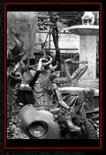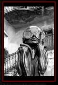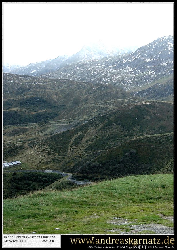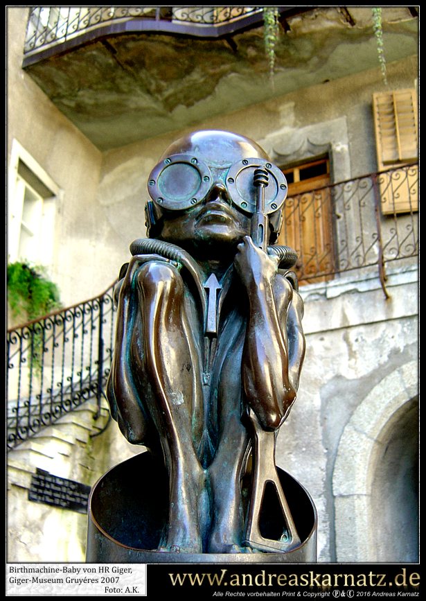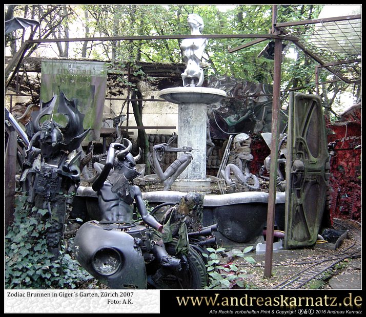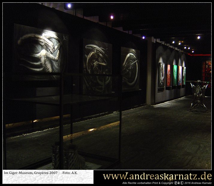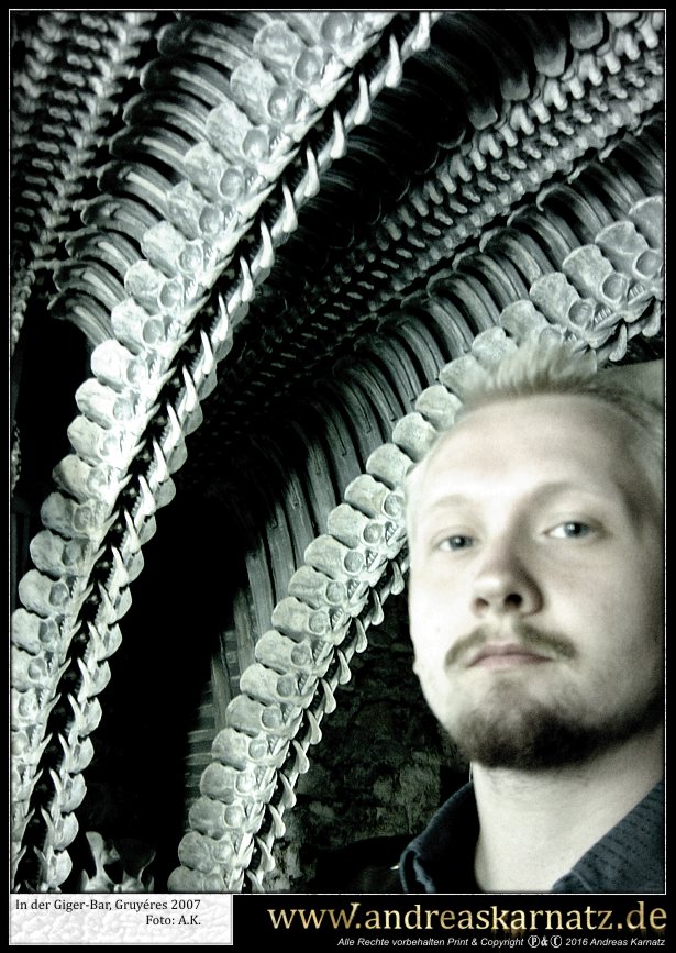 Am selben Abend hatte ich noch vor Ort einen kleinen Gig. Die sogenannte "Werkstatt", in der auch schon Größen wie Hans Söllner oder Element of crime auftraten, hatte ein tolles Ambiente doch leider schienen die Schweizer von meiner Musik nicht besonders angetan zu sein. Dies äusserte sich auch in der spartanisch ausfallenden Kollekte im Anschluss des Konzerts. Man sollte ganz einfach nicht sein Konzert mit den Worten, "Guten Abend! Mein Name ist Andreas Karnatz und ich bin kein Terrorist sondern nur ein deutscher Tourist...", beginnen. Der Besitzer war überaus freundlich und lud mich sogar noch zum Essen ein. Nun, eines weiß ich seitdem. Ich esse nie wieder in meinem Leben Humus. Dieser grüne Knallerbsenbrei sah genau so aus wie er schmeckte. Trotzdem einen Dank und liebe Grüße an Nico. Die Schweizer, so wie ich sie erlebt habe, sind ein bedachtes und freundliches Völkchen, die ich irgendwie in mein Herz geschlossen habe. In den nächsten Tagen arbeitete ich mich dann langsam durch das Schweizer Hinterland zum Giger Museum nach Gruyéres vor. Es war interessant zu sehen, wie inmitten all dieser Rösti- und Fonduerestaurants, jener schwarze Monolith von einem Museum stand. Dort im Spell-Room begreift man erst, was HR Giger geschaffen hat. Ich ziehe meinen Hut und bin angepisst über so viel Kreativität. Auf jeden Fall gönnte ich mir das ein und andere Getränk in der gegenüberliegenden Giger-Bar und genoss diese Zeit ausgiebig. Als krönenden Abschluss meiner Reise empfing mich der Hohepriester und seine getraute Carmen in ihrem bescheidenen Reihenhaus in Zürich. Giger hatte zwar nur kurz für mich Zeit, aber wann erlebt man schon so etwas. Er signierte mir meine Zeitungen und anschließend machte Carmen von uns noch ein paar Fotos. Später unterhielt ich mich noch gut 2 Stunden mit ihr in der Küche über Gott und die Welt, inklusive einer Führung durchs Haus. Dort sah ich in Giger´s Atelier noch nicht beendete Bilder und fühlte mich privilegiert über solch Freundlichkeit einem eigentlich Fremden gegenüber. Giger fragte mich, ob ich denn schon den Garten gesehen hätte. Also kam ich, bevor ich meine Reise nach Hause antrat, noch in jenen Genuss. Dabei wuselten immer irgendwelche Arbeiter durch den verwilderten Garten und so musste ich zwangsläufig an Dracula denken. Jener Graf, der Lakaien für den Transport seiner fauligen Erde und Kisten beauftragt hatte. Sklaven im Dienste des Meisters. Ameisen darauf bedacht, das Reich der Königin, in diesem Fall Giger, weiter auszubauen. Und ich wusste, dass der einzige Mensch, dem ich Sklave sein wollen würde, Hansruedi Giger wäre. Da der König mich nicht in die Reihen seiner Heeresscharen rief, war meine Mission erfüllt. Nach zwei Wochen im Auto wollte ich nur noch in einem anständigen Bett schlafen; und es wurde nachts langsam auch immer kälter. Dies war also im Nachhinein betrachtet das Einzige was mir meine Zeitung einbrachte. Jene Reise und das ich HR Giger etwas näher kennen lernen durfte. Es war ganz einfach groß und intensiv. Dieser Trip hat in meinem Gedächtnis schon jetzt eine mythische Qualität erreicht. Auf den Spuren des Meisters quer durch die Schweiz. Als ich HR Giger mal in einem Traum fragte, warum er erst zögerte bei meiner Zeitung mitzumachen, antwortete